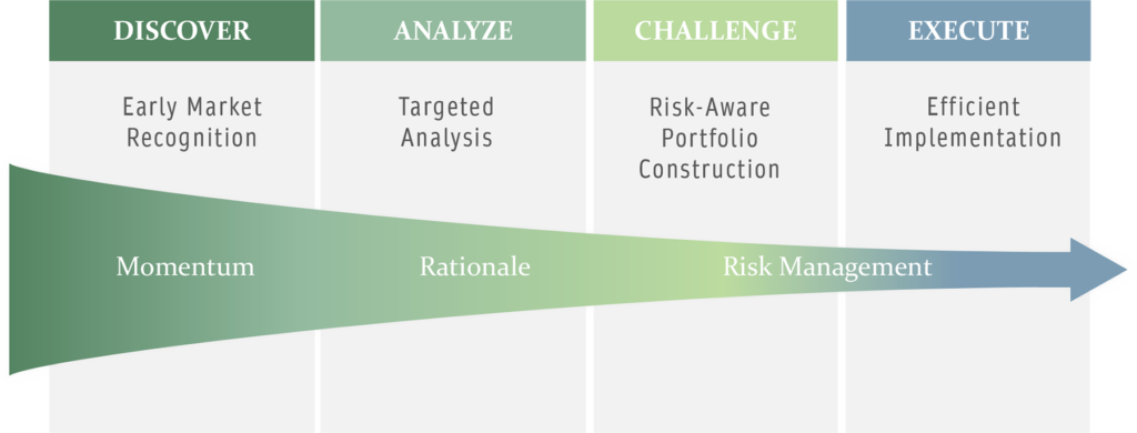 All of our strategies employ the same daily, bottom-up investment process that is disciplined and objective. The process consists of four distinct actions – Discover, Analyze, Challenge, and Execute.
